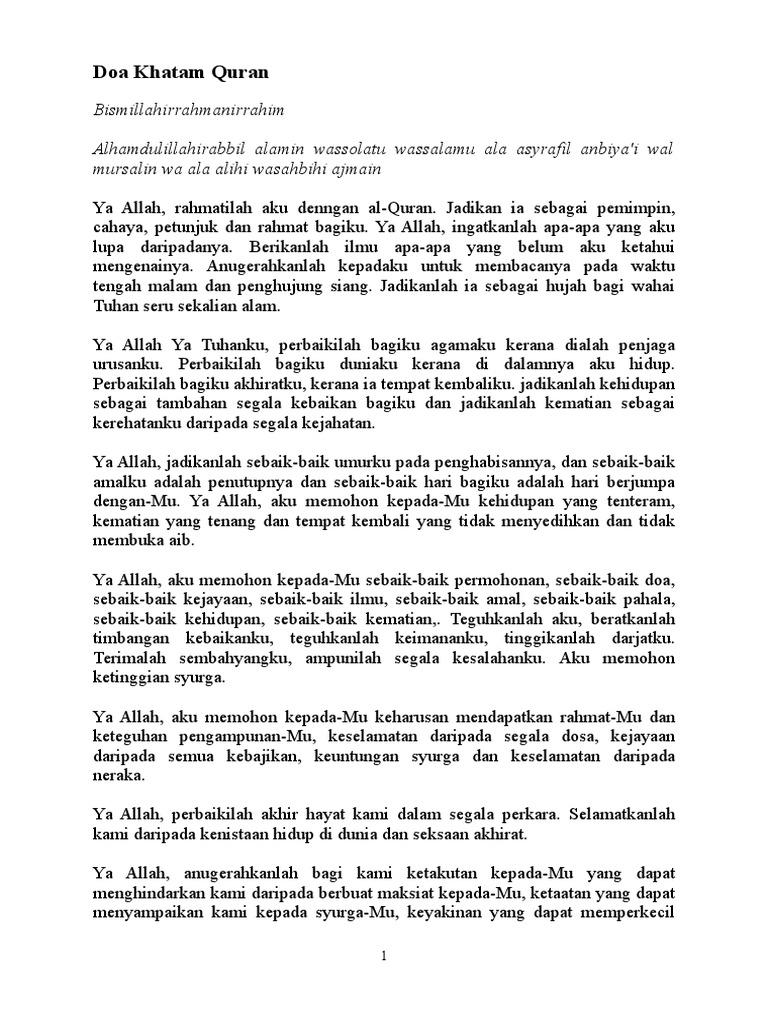 Doa Khatam Al Quran Arab. DOA KHATAM AL-QURAN VERSI BAHASA MELAYU THE FINAL REFERENCE Bismillahirrahmanirrahim Alhamdulillahirabbil alamin wassolatu wassalamu ala asyrafil anbiyai wal mursalin wa ala alihi wasahbihi ajmain Ya Allah rahmatilah aku denngan al-Quran. - Lengkap 1-30 Juzuk dalam naskhah berbeza.
